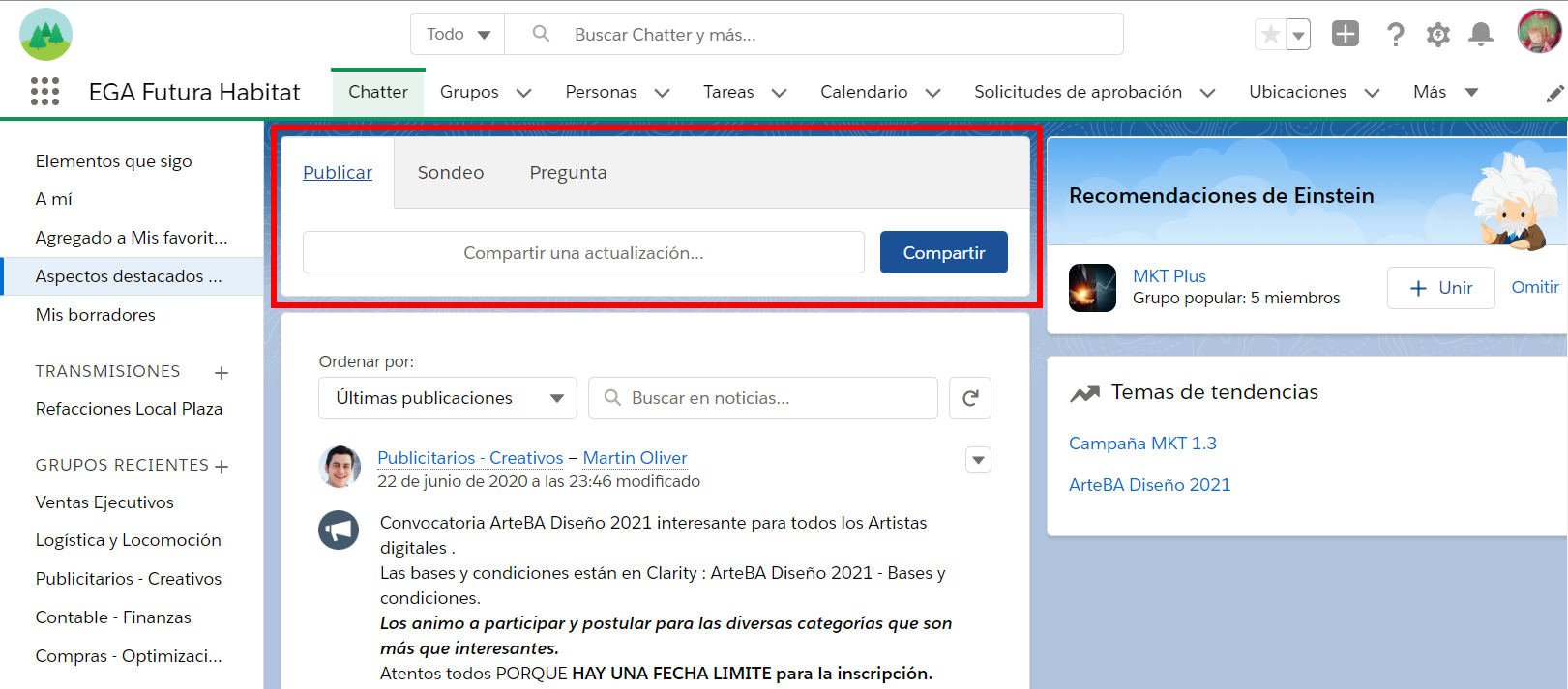 Tal como hace un usuario para publicar actualizaciones en el muro de una red social, el usuario de EGA Futura utiliza el Publicador de Chatter para postear contenido en tiempo real.