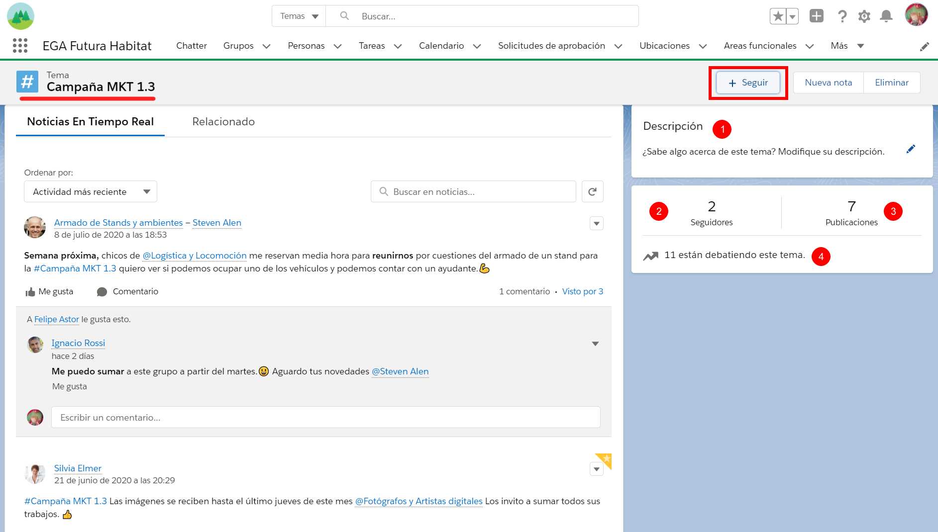 Una vez que se ha insertado un #Tema en una publicación, comentario o registro, cada vez que una persona haga clic sobre esa etiqueta viajará a una página que mostrará en orden cronológico todas las publicaciones y comentarios a los que tiene acceso, que incluyeron el #Tema.